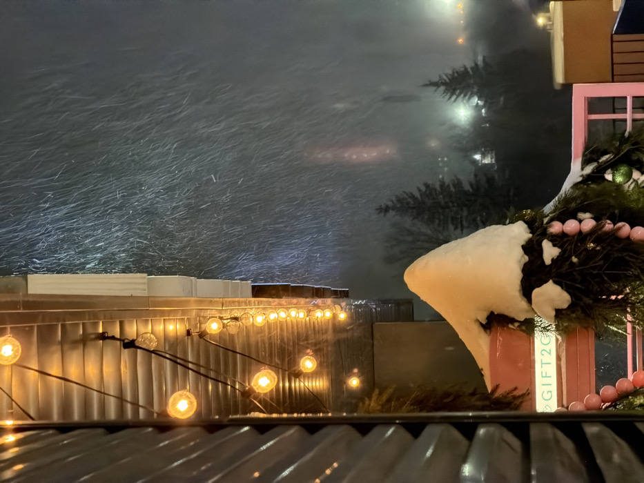 Snow falls heavily across a night scene. Illuminated string lights run horizontally along a corrugated metal roof edge, casting a warm glow. Beyond this, a building displays a snow-laden Christmas tree atop a pink box with green lettering. Bare trees stand blurred in the background, reflecting diffuse light from unseen sources, accentuating the wintery atmosphere.
