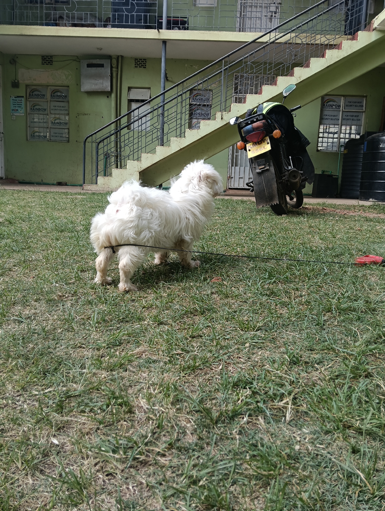 white dog on a leash standing on a grass lawn in front of a two-story building. A motorcycle is parked nearby with a Kenyan license plate reading "KMDW 556L." The building is painted green and has multiple windows with "RAINBOW SECURITY SOLUTION" signage. There are also large black water tanks in the background. The location appears to be in Nairobi, Kenya.