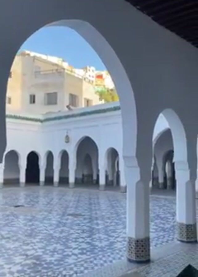 n outdoor courtyard with white arches and columns. The floor is tiled with blue and white geometric patterns. A wrought iron railing runs along the edge of a slightly elevated walkway. There are stairs leading down to the courtyard. In the background, buildings are visible. The video appears to be taken on a sunny day.