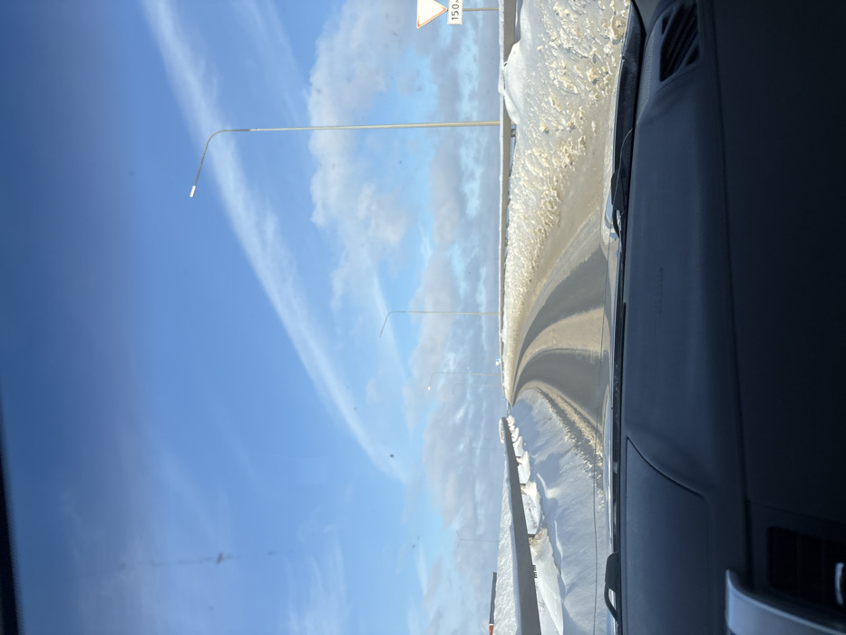 A driver's perspective on a snowy highway. The road curves ahead, flanked by thick walls of snow and a metal guardrail. Streetlights line the highway. Above, a clear blue sky is streaked with thin, linear clouds. A road sign is visible in the distance. The interior of the car occupies the right side of the frame.