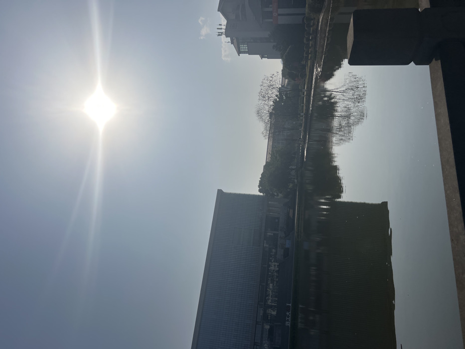A bright sun shines above a cityscape reflected in still water. Buildings line the water’s edge, with trees adding depth to the scene. The reflection captures architectural details and the bare branches of trees, creating a mirror image. A stone structure is present in the foreground, partially obscuring the view. The composition is bathed in sunlight, creating a hazy atmosphere.