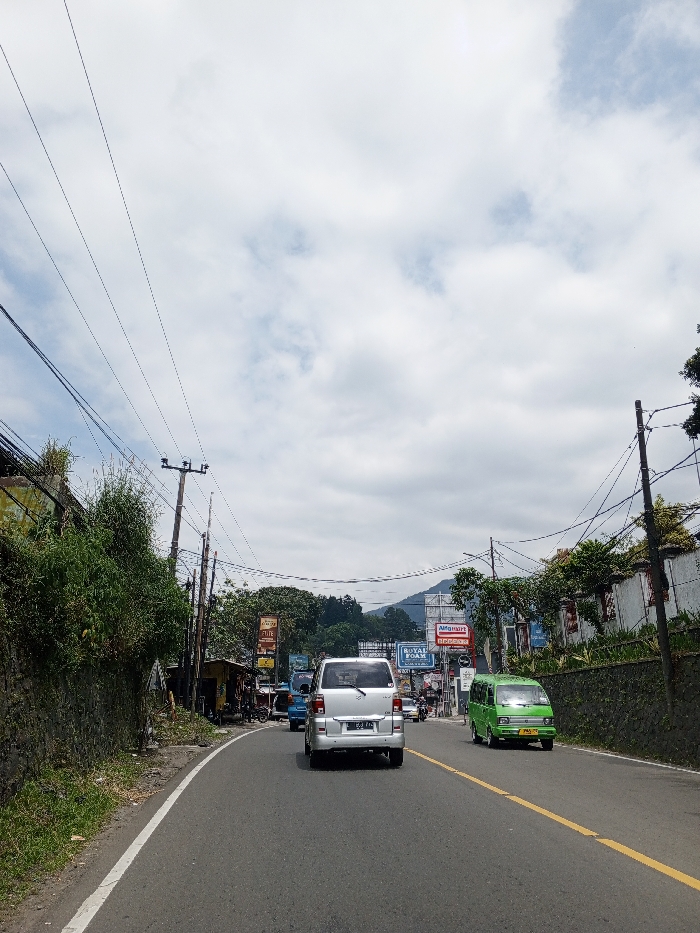 The image depicts a two-lane asphalt road in Cisarua, Indonesia, under an overcast sky with scattered clouds