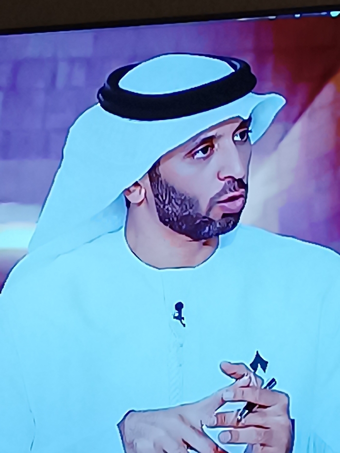The image depicts a male individual, likely of Middle Eastern descent, shown from the upper chest upwards. He is dressed in a white thobe and a white ghutra with a faint light blue hue, secured by a black agal. His face features a dark, neatly trimmed beard and mustache. He is looking to his upper right with a slightly open mouth, indicating a moment of speech or focused listening. A small black lavalier microphone is clipped to the right side of his thobe. His right hand, positioned centrally, holds a slender, dark object, possibly metallic, with a distinct, upward-pointing, fin-like or flag-like element at its top, clutched between his thumb and index finger. The background is a soft-focus blur of purple, blue, and muted red tones, exhibiting indistinct vertical and horizontal patterns, consistent with an indoor television studio set in Unknown, Unknown.