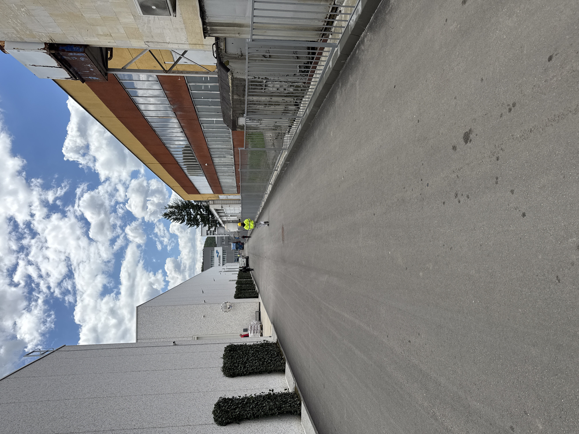 street scene in Gabrovo, Bulgaria. The view is along an asphalt road, with buildings on either side. On the left is a long, light gray industrial building with dark green shrubs along its base. On the right is a taller building with a yellow and brown facade and a metal fence above. A person wearing a yellow vest is walking in the distance. The sky is visible above the buildings, with white clouds against a blue sky.