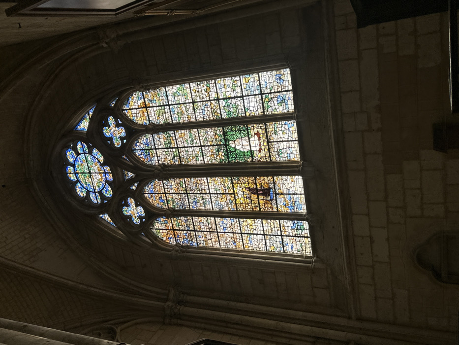 A large, arched Gothic stained-glass window is depicted from an interior perspective within the Cathédrale Saint-Pierre de Beauvais, France