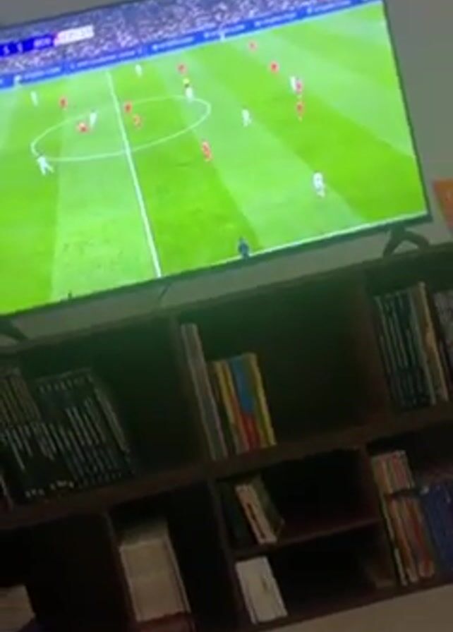 television displaying a soccer match between Real Madrid (RMA) and Benfica (BEN). The score is tied 1-1, and the game is in the 47th minute. Players in white (presumably Real Madrid) and red (Benfica) are visible on the green field. The television is positioned on top of a brown bookshelf, which is filled with numerous books. The camera angle shifts slightly during the video.
