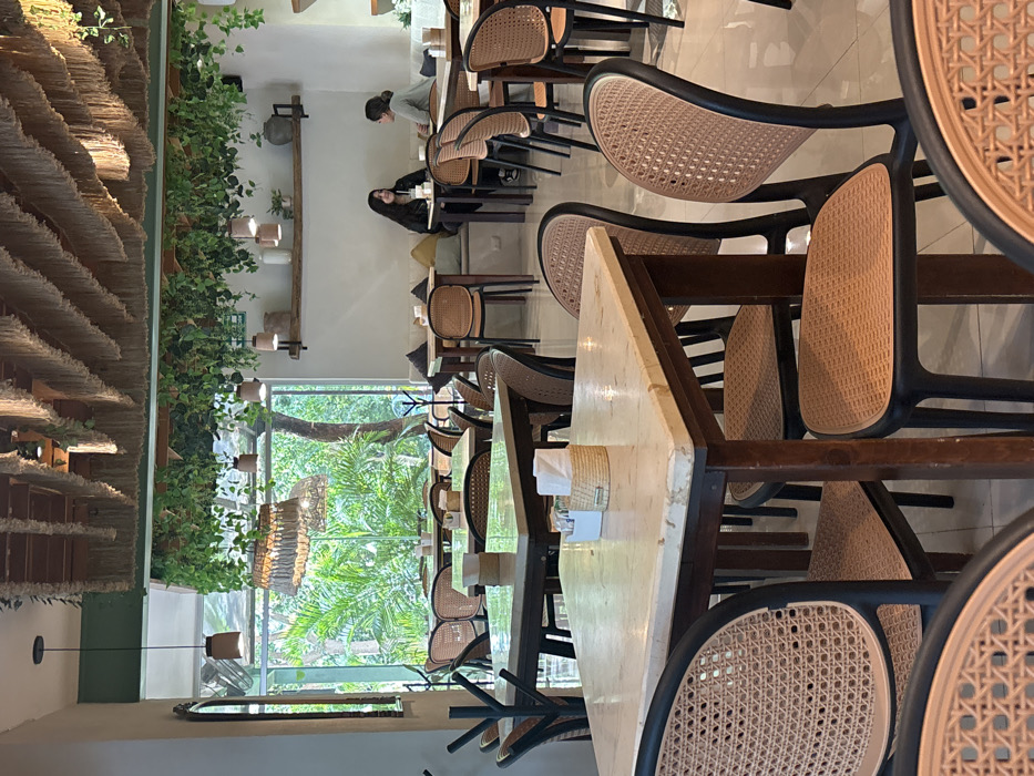 The image displays an indoor dining area with numerous tables and chairs. The tables are topped with marble and accompanied by woven, rattan-style chairs. Abundant greenery, including potted plants, hangs along the wall. A large window shows trees, suggesting a natural environment. Two people are visible in the background.