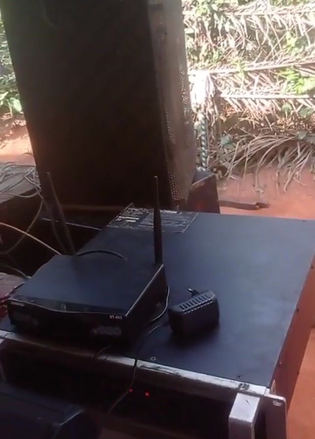 A close-up shot shows audio equipment set up outdoors. A black Shure UT-883 wireless receiver sits on top of a silver Power Amplifier P3300S. A black Yamaha keyboard is to the left. In front of the keyboard, a blue charging unit holds two blue batteries, a red light indicating they are charging. Multiple power cords are plugged into a blue power strip. Behind the equipment, a young child stands near a large speaker. The ground is red dirt. Foliage is visible in the background. Music is playing.