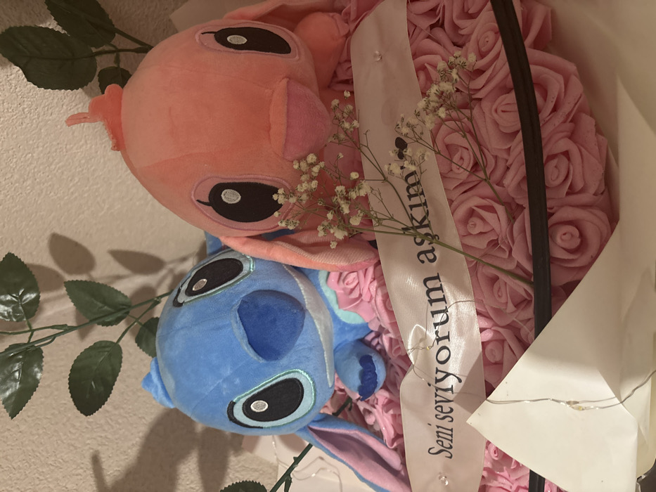 The image displays a domestic scene located in Svishtov, Bulgaria, featuring a themed decorative arrangement. Two plush toys are central: a blue figure resembling Stitch from Lilo & Stitch is on the left, and a pink figure resembling Angel from Lilo & Stitch is on the right. Both plush toys exhibit large, black oval eyes with distinct white circular highlights. They are positioned upright on a dense, circular base composed entirely of numerous small, artificial pink roses. A white satin ribbon is draped horizontally across the top of the rose base, inscribed with the black Turkish text "Seni seviyorum aşkım." Several sprigs of dried baby's breath, characterized by tiny white flowers, are placed atop the ribbon and roses. A string of small, warm-white LED fairy lights is partially visible, interwoven among the pink roses and under the ribbon. The background consists of a plain, light-colored wall, against which artificial green vine leaves are arranged, casting soft shadows. The overall lighting is even and ambient, suggesting an indoor setting.