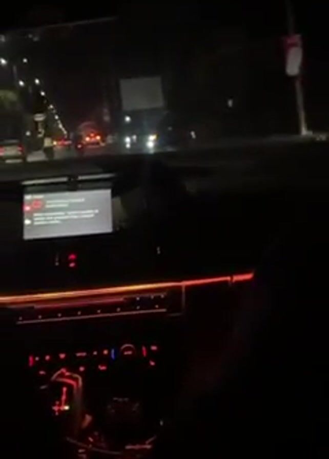 A view from inside a car moving at night. The dashboard is visible, with red ambient lighting illuminating the controls. The infotainment screen displays a notification. Through the windshield, streetlights and other cars can be seen. The car appears to be driving on a city street with moderate traffic.