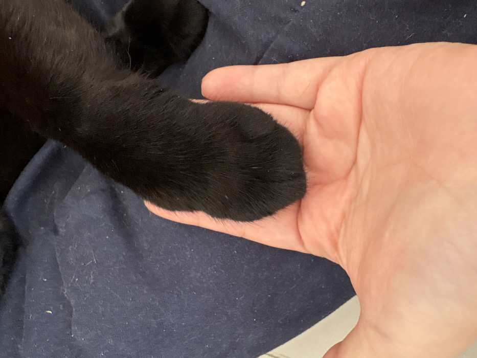 - "The image displays a close-up, high-angle view of a human's open palm supporting the front paw of a black feline" by FM-hKfOI2, licensed under CC BY 4.0
