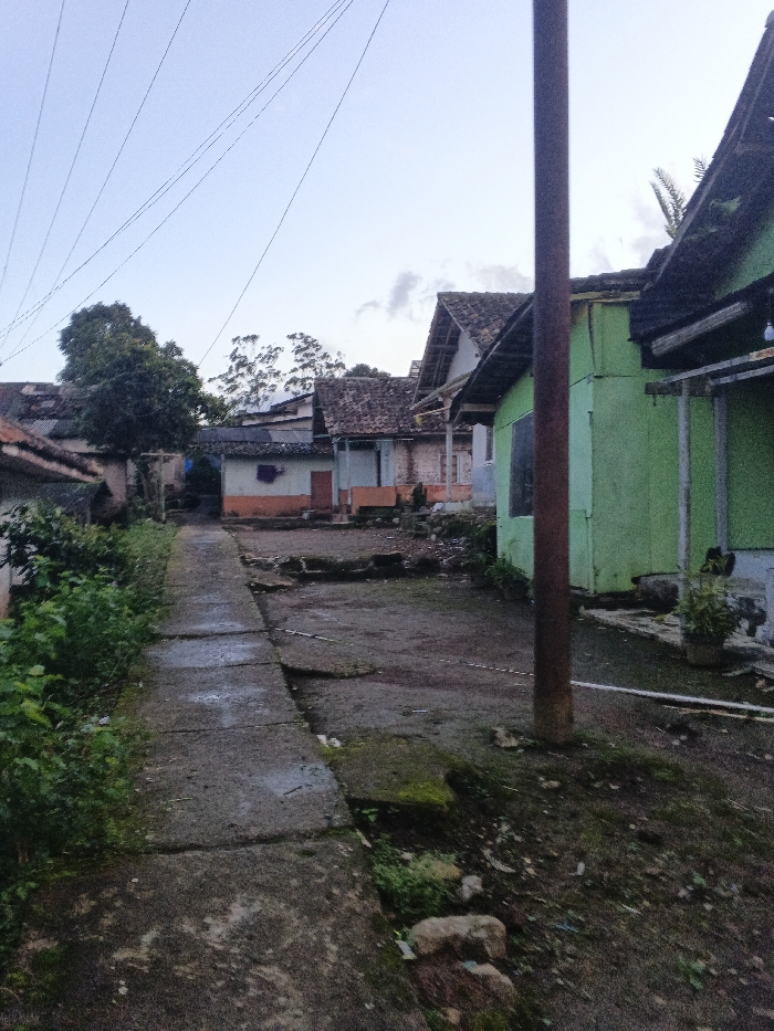 The image displays a static outdoor scene of a residential area in Unknown, Uruguay, under a light blue, partially cloudy sky. A concrete pathway, appearing damp and mossy in sections, extends from the lower left foreground into the mid-distance. To the left of the path, dense green foliage and overgrown vegetation are present. To the right of the path, the ground consists of uneven dirt with sparse green growth, exposed soil, and scattered rocks. A dark brown utility pole stands vertically in the mid-right foreground, with a white pipe and a potted plant visible at the base of a nearby structure. The midground features a cluster of modest, single-story houses. The closest structure on the right is a building with lime green siding and a dark, sloped tiled roof with an overhang. A dark, rectangular window is visible on its side. Further down the path, another house displays an orange lower wall, a lighter upper section, and a dark door; a red piece of clothing is draped outside this residence. Additional houses with reddish-brown tiled roofs are visible in the background, interspersed with various trees and green foliage. Multiple utility lines stretch diagonally across the upper left portion of the sky. No individuals or animals are visible in the scene.