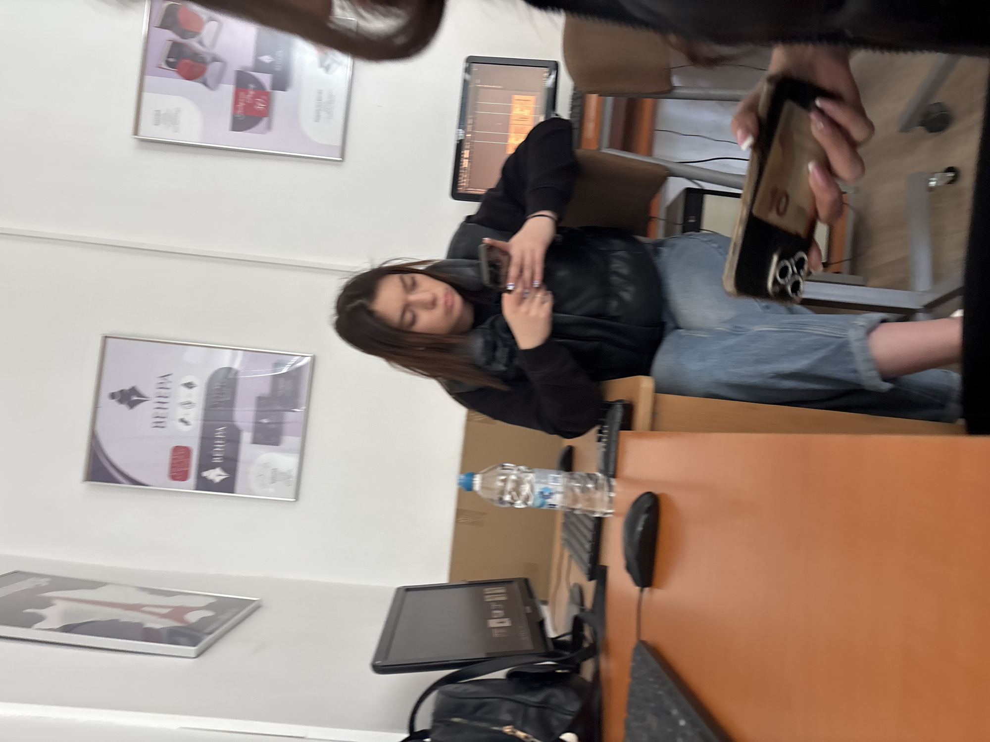 In a classroom or office setting, a young woman in a black vest and blue jeans sits engrossed in her phone. Beside her, a desk holds a computer, a water bottle, and a mouse. Framed artwork adorns the white wall in the background. A hand holding another phone is also visible, with the back having "10" written on it. The camera angle is slightly tilted.