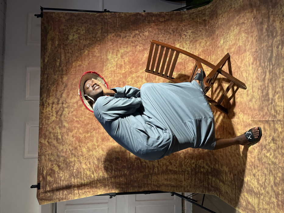 The image depicts a single adult male situated in a photographic studio environment, identified as being in Barakin Akawo, Nigeria. The subject, wearing a light blue-grey, long-sleeved robe, a straw hat with a red brim, and black sandals marked with white 'XX' symbols, is positioned with his left foot resting on the seat of a brown, slatted wooden folding chair. His body is slightly angled, with his head tilted to the left, his eyes closed or squinted, and his mouth in a smile. His right hand is raised, fingers touching his right cheek. The background consists of a large, vertically draped fabric backdrop in mottled shades of brown, orange, and yellow. To the left of the backdrop, a white wall section with a visible door frame and a black light stand with a clamp are discernible. Lighting appears to originate from the left, casting shadows from the subject and the chair onto the backdrop.