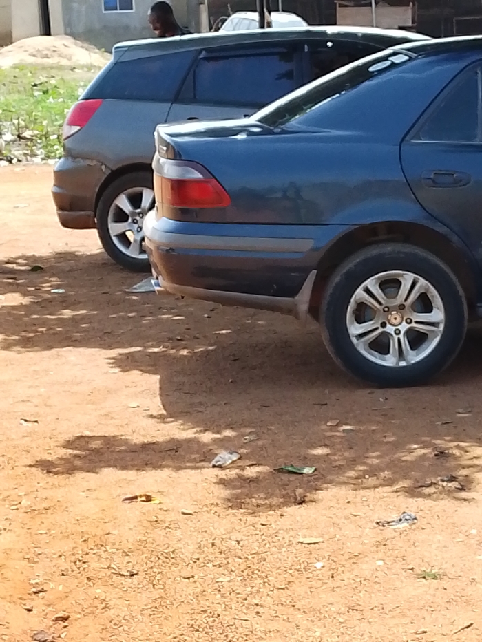 The image depicts an outdoor scene in Oke Onigbin, Nigeria, characterized by an unpaved reddish-brown dirt surface. Two passenger vehicles are parked side-by-side, facing away from the camera. In the foreground, a dark blue sedan, likely a Toyota Corolla model, is positioned with its right rear quarter visible. It features a prominent taillight assembly with red and clear sections, a dark lower bumper trim, and a multi-spoke silver alloy wheel on the right rear axle. Immediately behind this sedan, a grey or dark green station wagon or hatchback is partially visible, showing its left rear quarter and a similar multi-spoke silver alloy wheel. A single individual, a dark-skinned person wearing a dark top, is partially observed standing behind the grey vehicle, looking towards the right of the frame. The background includes a light-colored building with a blue window and what appears to be a pile of construction material or dirt. The ground shows scattered debris, including pieces of paper and plastic, along with shadows from an unseen overhead source, indicating daylight conditions. No overt actions or interactions are discernible.
