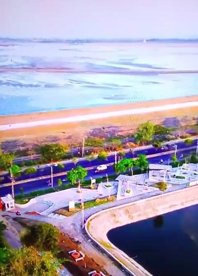The aerial shot shows a coastal view with a large body of water extending to the horizon. There is a strip of land with a road running along it, bordered by trees and greenery. A curved embankment forms a dark, still reservoir. Cars and motorbikes move along the road. White geometric structures are seen near the embankment. The sky is overcast and bright.