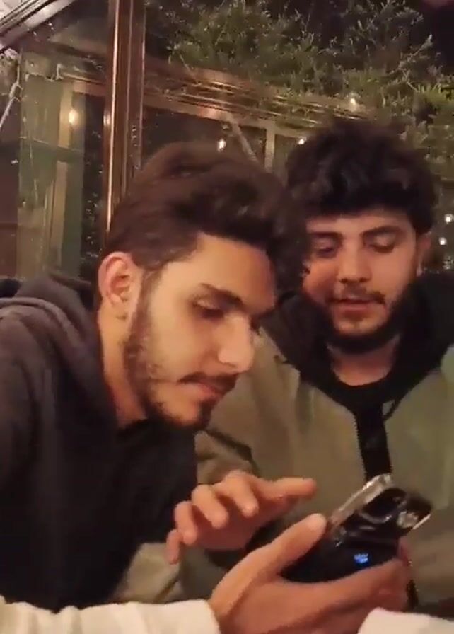 Two young men are sitting at a table, looking at a smartphone. The man on the left is wearing a grey and white hoodie and has a beard. The man on the right is wearing a green jacket and also has a beard. They are sitting in an enclosed outdoor dining area, surrounded by glass panels. There is a glass with a drink in it on the table, as well as what looks like a napkin or a box. The man on the left is holding the phone and appears to be using the touchscreen, while the man on the right looks on. They seem engaged in the content on the phone.