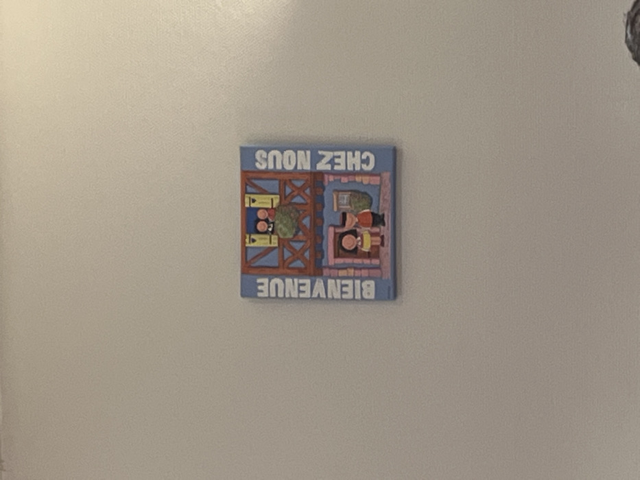 A square piece of artwork is centrally mounted on a plain, light-colored wall. The artwork depicts a stylized, cartoon rendition of a traditional Alsatian half-timbered house, characteristic of the architecture found in cities such as Sélestat, France. The house features a brown timber frame with yellow walls on the upper story and blue walls on the lower story. On the upper level, two figures are visible peering out of a window with yellow shutters, below which a green plant or bush is depicted in a window box. On the lower level, a female figure wearing a yellow top and brown skirt stands beside a male figure in a red top and brown pants, both positioned in front of a pink-framed door. Flanking the house on a blue background are vertical white capital letters: "BIENVENUE" (Welcome) on the left side and "CHEZ NOUS" (Our Home) on the right side. The wall is featureless, and the exact physical location of this wall and artwork within Sélestat, France, cannot be determined from the image.