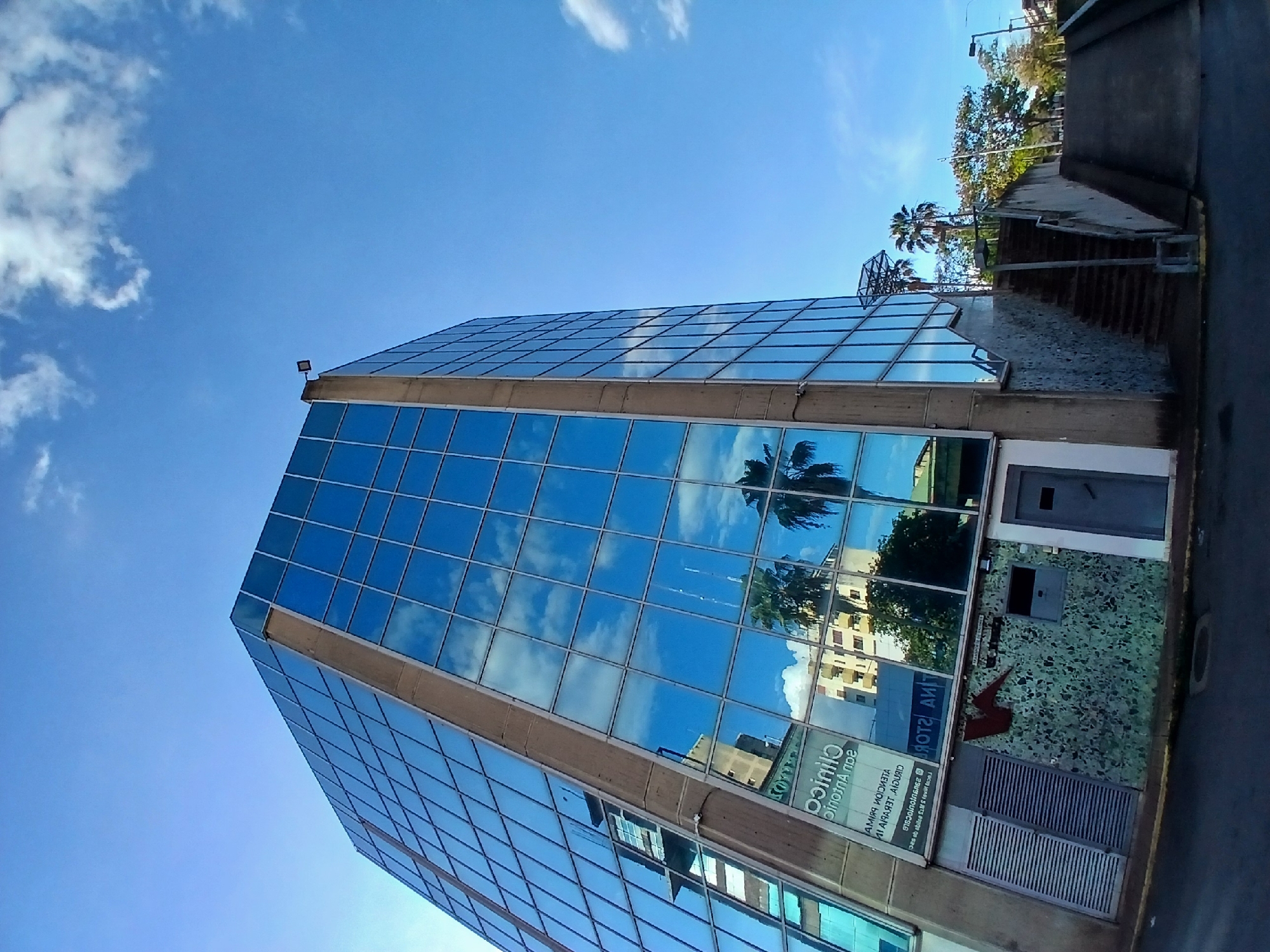 The image captures the Clinico San Antonio building in Ciudad Guayana, Venezuela. It is a tall, modern building with a glass facade reflecting the sky, clouds, and surrounding buildings. Palm trees are visible in the reflection. The lower part of the building has a concrete exterior with a door and ventilation grates. A sign with the clinic's name is visible, although partially obscured by the reflection. A set of stairs and a concrete walkway are adjacent to the building. The sky is clear and blue with scattered clouds.