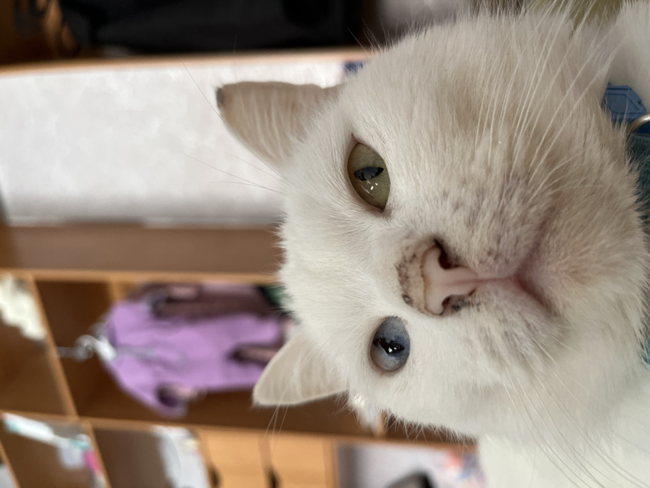 The image depicts a close-up, low-angle view of a white cat's face in an indoor setting. The cat exhibits heterochromia; its left eye has a blue iris with a dark, irregular pupil or anterior iris anomaly, and its right eye has a greenish-yellow iris with a similar dark, irregular feature. The cat's nose is pink with dark pigmentation or debris on its bridge and around the nostrils. White whiskers extend from its muzzle. A light blue collar is partially visible at the bottom of the frame. The background is out of focus. To the upper left, a wooden shelving unit or wardrobe is visible, containing a blurred purple infant's romper hanging on a hanger, and a white, fluffy object on an upper shelf. The upper right background shows a light-colored wall with a darker, vertical object partially visible on the far right. The environment appears to be a domestic interior. The exact location within the city of Chaikovsky, Russia, cannot be determined from the visual information provided in the image.