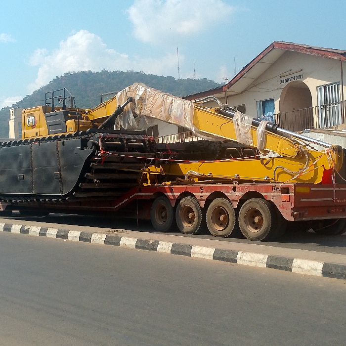 - "A large, yellow and black CAT-branded excavator, identified by its distinctive black pontoon-style undercarriage and yellow boom assembly, is loaded and secured onto a red multi-axle lowboy trailer" by FM-DaJMg2, licensed under CC BY 4.0