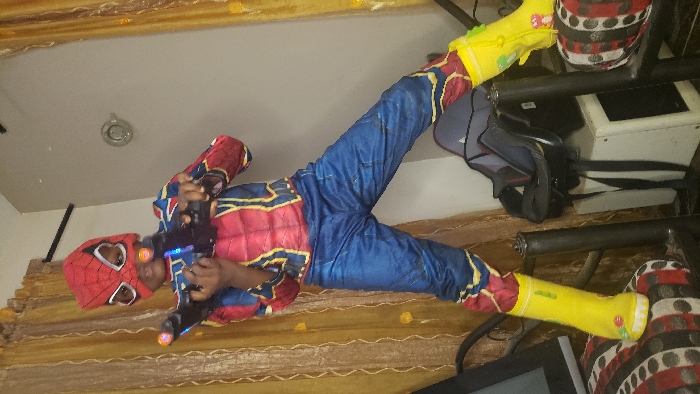 A person in a Spider-Man costume, complete with a mask and bright yellow boots, strikes a pose with two toy guns. The guns have glowing elements, and the person is positioned diagonally across the frame. The background includes parts of a room with a patterned curtain and a collection of furniture or equipment, some of which is partially visible.
