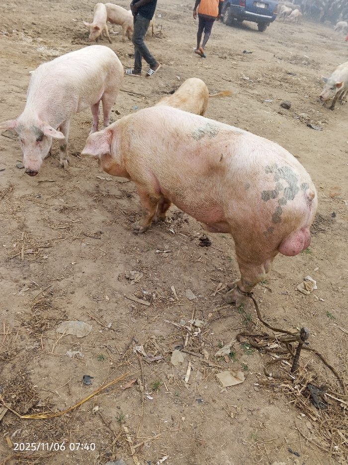 A group of pigs occupies a dirty, dusty area with scattered debris. The largest pig in the foreground is pink with dark spots and is tethered to the ground. Another pig stands to the left, while others are visible in the background, including some near a vehicle. People are also present in the background. The ground is barren and littered, suggesting a holding area for livestock. A date stamp is present in the lower left corner.