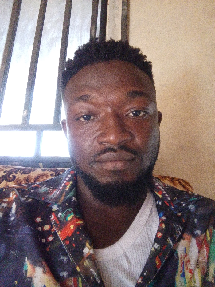 A male individual, appearing to be in his twenties or thirties, with dark skin, a short, textured dark haircut, and a trimmed dark beard, is depicted in a close-up, head-and-shoulders portrait