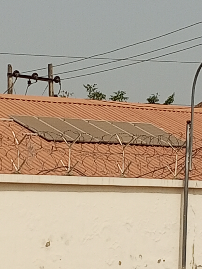 The scene depicts an exterior view of a building in Karu, Nigeria, under a clear, light grey sky. In the upper portion, two wooden utility poles with insulators and multiple overhead power lines are visible. Below the power lines, a reddish-brown corrugated tiled roof is present, featuring a rectangular array of six dark-colored solar panels. Along the roof's edge, a white metal security barrier topped with coils of razor wire extends horizontally. Behind the roof, several small green leafy trees are discernible. The lower portion of the image shows a light-colored (cream/off-white) perimeter wall. A dark-colored pole, possibly a streetlight or utility pole, is partially visible on the far right edge of the frame. No individuals or active interactions are observed.