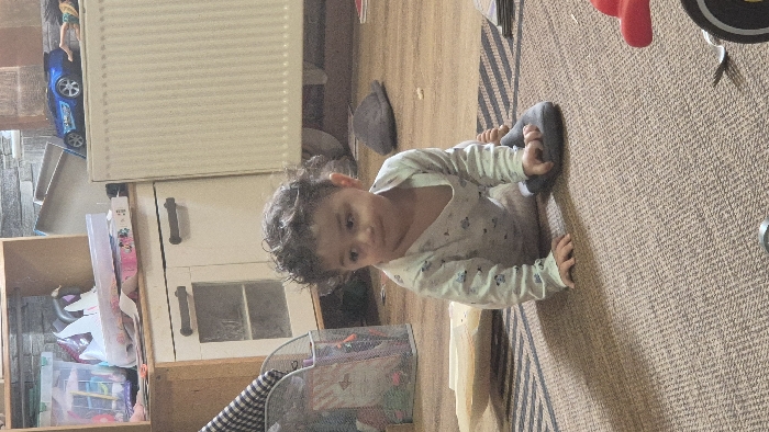 This image captures an indoor residential scene in Melle, Belgium. A single child, appearing to be a toddler with dark, curly hair and brown skin, is positioned on a light brown woven rug with darker striped patterns. The child wears a light-colored long-sleeve onesie patterned with small grey designs, possibly sheep or clouds. The child is crouched, resting on their knees and hands, facing left with a slight turn of the head and a subtle smile. A single dark grey slipper is worn on the child's right foot; the left foot is bare. In the immediate foreground to the right, a portion of a red and black toy, resembling a tricycle or ride-on toy, is visible. To the left of the child, a piece of light-colored, possibly paper or thin cardboard, lies flat on the rug. The background features a light-colored wooden floor extending behind the rug. Against the back wall, a multi-component storage unit is present. On the left, a light wooden shelving unit houses clear plastic bins containing various items, alongside papers and bags. Below this, a white cabinet with two doors and dark horizontal handles is visible, with its upper cabinet window revealing interior shelving. To the right of the cabinet, a tall, vertical white radiator is mounted against the wall. A blue toy car and a partially visible doll (resembling Barbie) are positioned on top of the radiator. The wall behind the radiator and cabinet appears to have a textured grey, possibly stone-like, finish. A metal mesh bin containing items is visible to the left, behind the child, adjacent to what appears to be a checkered fabric item. The scene is well-lit, casting soft shadows.