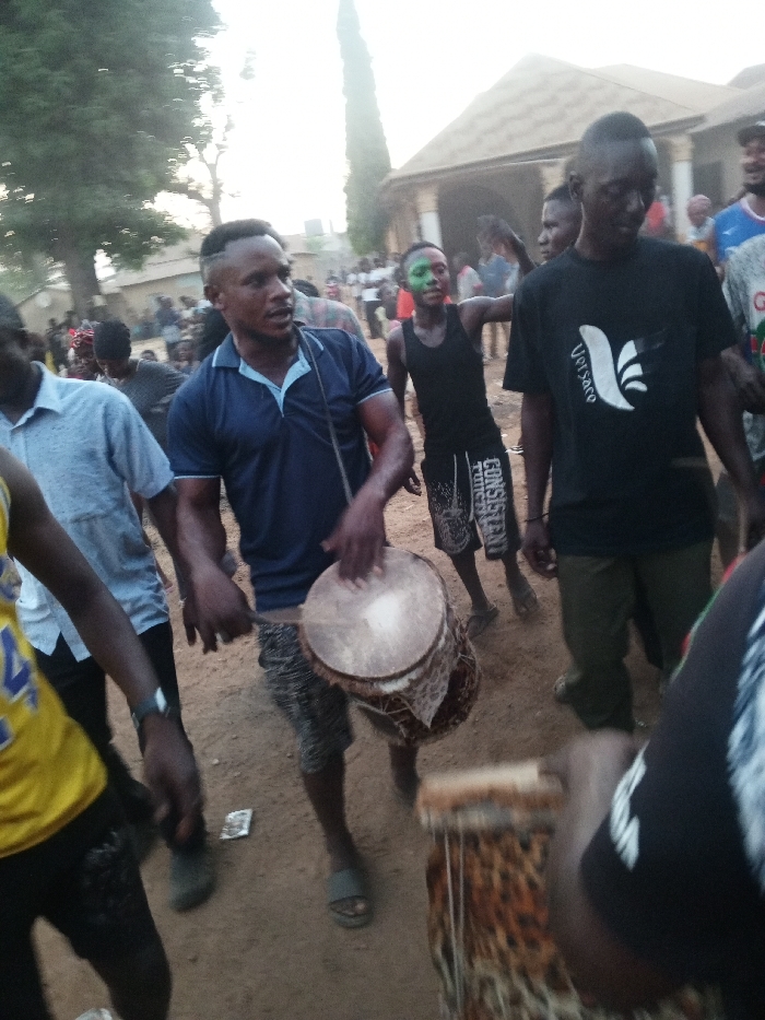 A group of people are gathered outdoors, several appearing to be drumming. One man is playing a drum held by a strap around his neck. Another man wears a black shirt with a white design. A boy with green face paint stands out amongst the crowd. There is a building in the background and trees on the left. The scene conveys a sense of cultural celebration or performance.