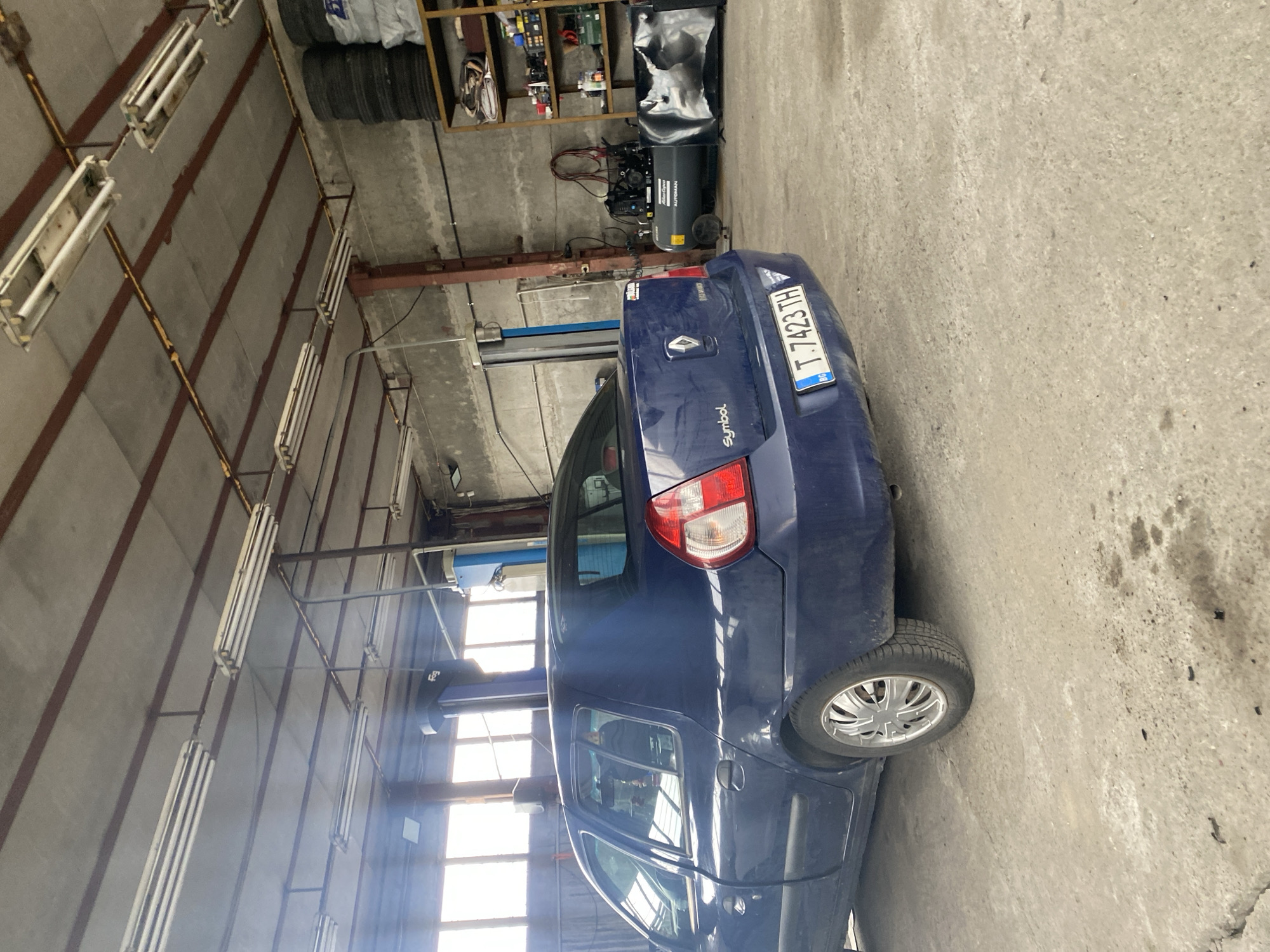 The scene depicts the interior of a vehicle repair shop or garage in Veliko Tarnovo, Bulgaria. A dark blue Renault Symbol sedan, bearing Bulgarian license plate T 7423 TH, is parked on a stained and cracked concrete floor, oriented with its rear towards the viewer and slightly to the right. The workshop features concrete block walls, some appearing grey, and a concrete slab ceiling supported by rusty-brown metal beams. Several rows of functional fluorescent tube lights are affixed to the ceiling. Bright natural light enters through multiple large windows on the left side of the frame. To the left and behind the vehicle, a blue hydraulic car lift, with "Fog" branding visible, is partially obscured. On the right side of the workshop, an "Atlas Copco Automaster" air compressor is on the concrete floor. Adjacent to it, against the wall, is a multi-tiered shelving unit containing various tools, containers, and parts. Above this shelving, a stack of tires is visible. No individuals are present in the frame.