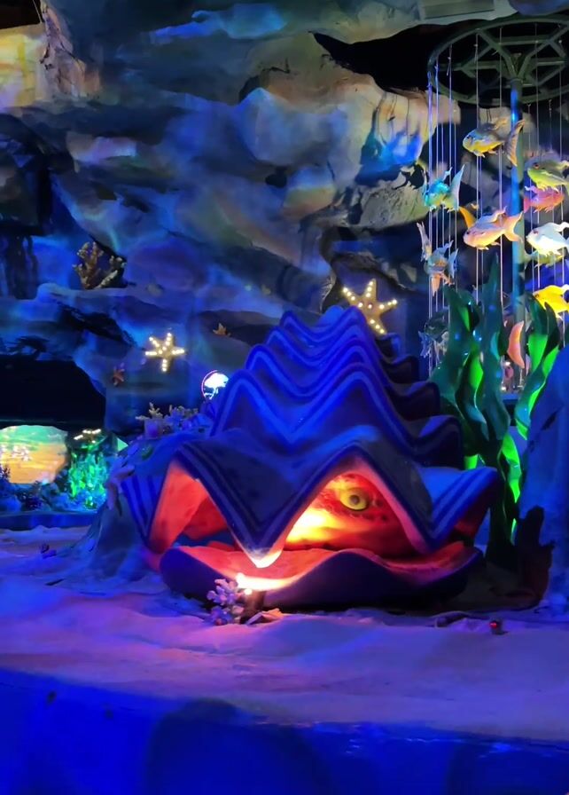 brightly colored underwater scene, likely part of a theme park attraction. A large, stylized clam shell with blue and purple outer ridges and a red interior is the central focus. A glowing light emanates from within the shell. A hanging mobile of colorful fish adds to the underwater theme. Starfish and coral decorations are scattered around the sandy base. The entire scene is illuminated with blue light, suggesting an underwater environment.