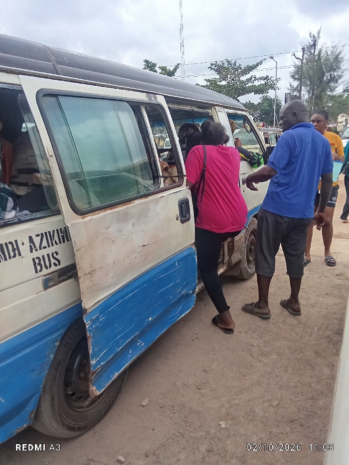A bus marked "NNAMDI AZIKIWE BUS" is stopped on a dirt road with passengers entering