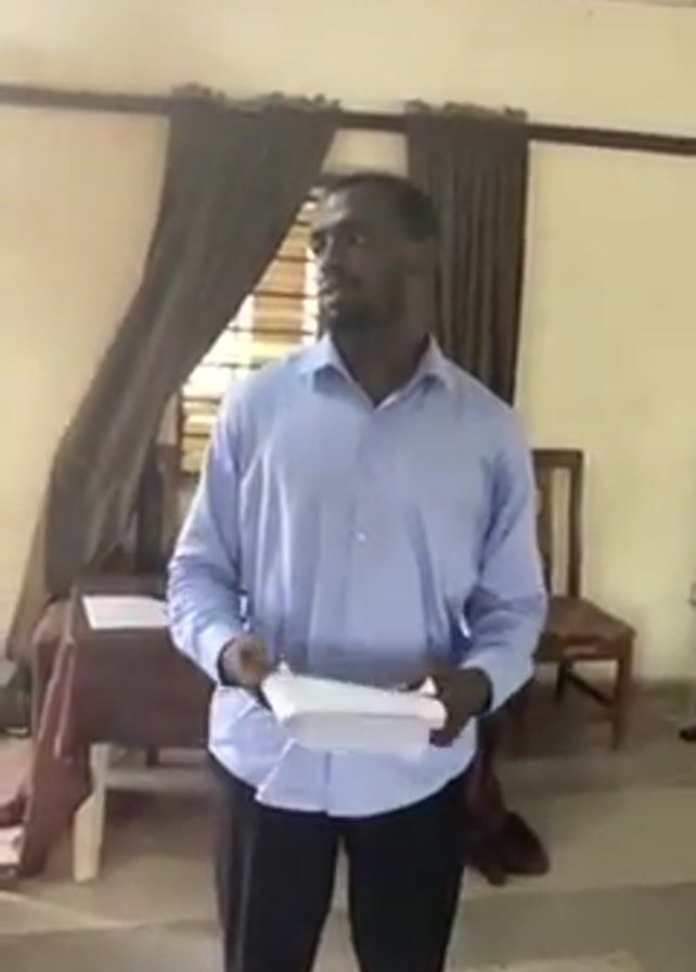 A person is standing in a room. The person is dark-skinned, has a beard, and is wearing a light blue shirt and dark pants. They are holding some papers in their hands and are looking to the right. Behind them is a table with a brown tablecloth and some papers on it. There is a window with brown curtains on the left, and a chair to the right. The room has a light-colored floor and ceiling. The person is speaking.