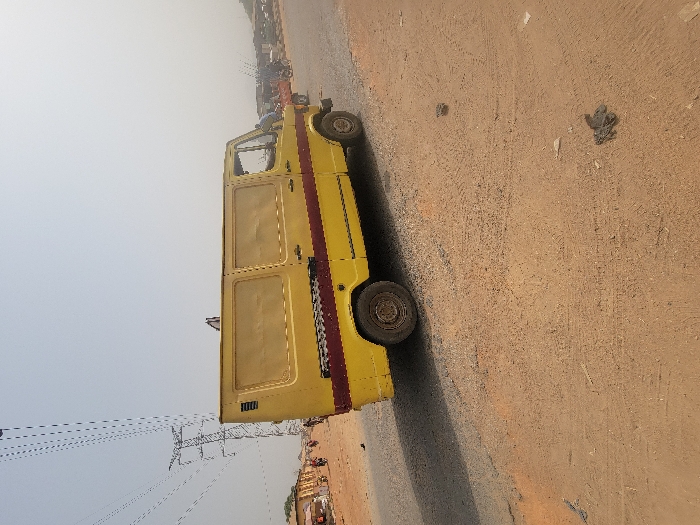 A yellow van, possibly a transport or delivery vehicle, is parked on a dusty road. The vehicle has a red stripe along its side and visible black tires. The road appears to be made of dirt and has tire tracks. In the distance, buildings and power lines can be seen under a somewhat hazy sky.