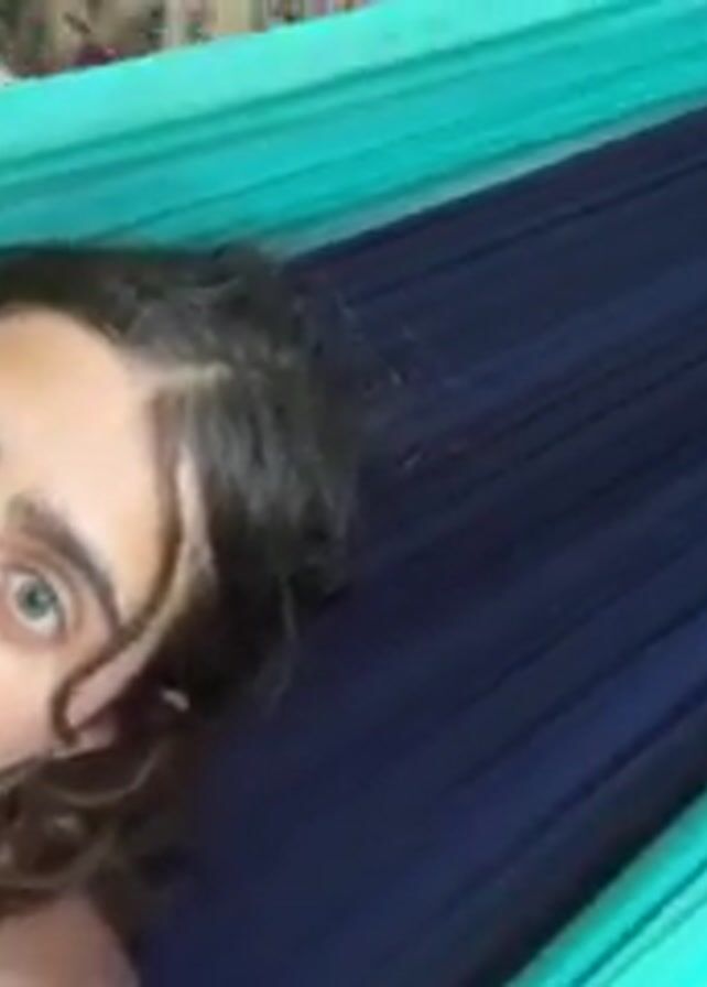 A woman with brown curly hair, wearing a red bikini, is lying in a green and blue hammock. She is looking up at the camera and making a kissing face. The camera rotates to show more of her body in the hammock and her legs extended to the side. Behind her is a rocky cliff face with green vegetation.
