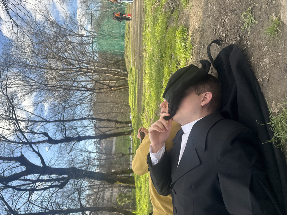 The image depicts an outdoor daytime scene in a public park within the city of Guimarães, Portugal. In the foreground, a male individual lies on his back on a black fabric (likely a traditional academic "capa") placed on dirt and sparse grass. He wears a black suit jacket over a white shirt. A black academic "capa" is draped over his head, obscuring his face from the eyes downward, with his right hand holding the fabric over his mouth and chin area. Partially visible to his left, another person lies on the ground, wearing yellow clothing. The midground features a dirt path and green grass, interspersed with numerous tall, bare deciduous trees, indicating a season like winter or early spring. In the far midground on the right, a tall green net structure is visible, behind which two distant figures stand near an orange cone. The background reveals a distant cityscape with buildings and additional trees on an elevated slope under a mostly clear blue sky with some white clouds.