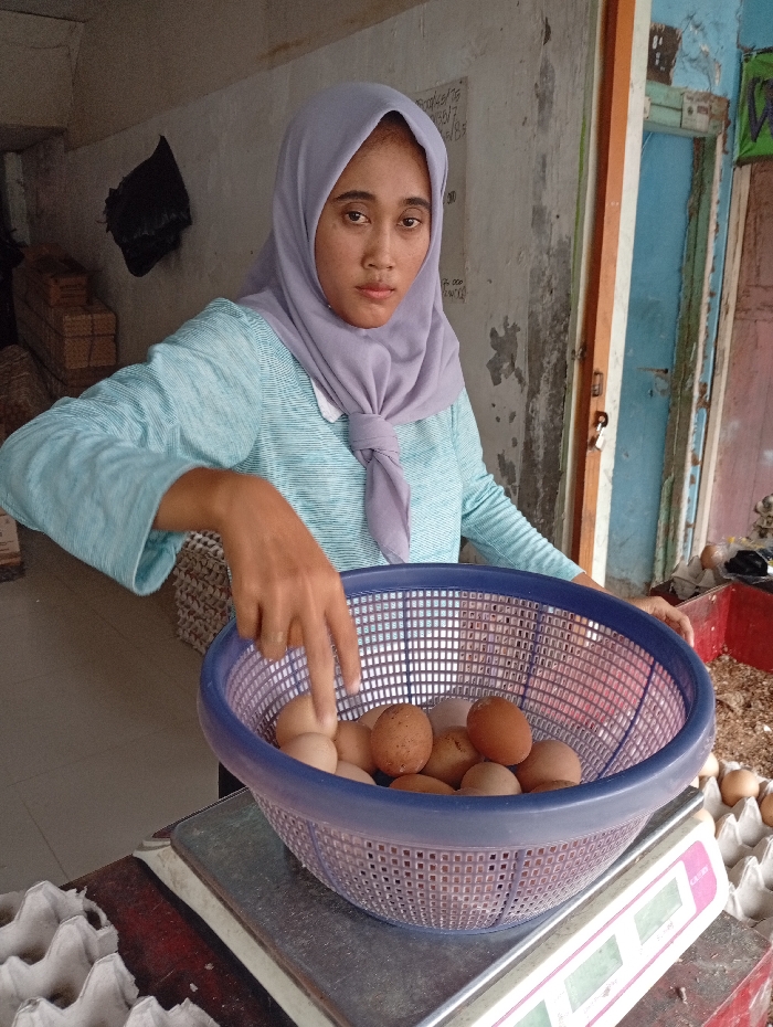A woman wearing a light blue top and a light purple hijab stands behind a counter. She is pointing her fingers into a blue plastic basket filled with brown eggs, which is sitting on a digital scale. Egg cartons are visible on the counter. A worn door and a partially obscured wall are behind her. The overall setting suggests a small shop or market stall.