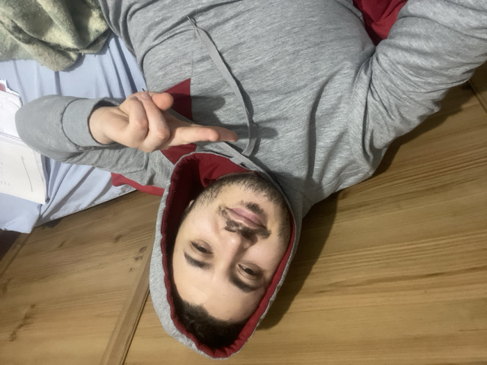 A man wearing a gray hoodie with a red interior lies on his side on a wooden floor. He's looking directly at the camera, making a hand gesture. Part of a bed with a blue sheet and some papers are visible in the background on the left side of the image.