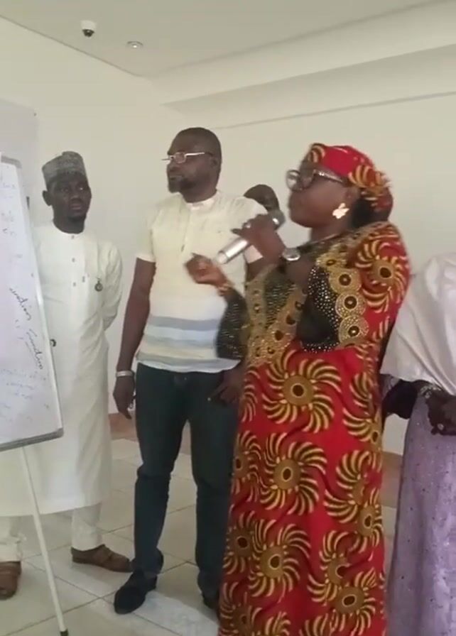 woman speaking into a microphone. She is wearing a red and gold patterned dress with a matching head wrap. There are several other people in the room, including two men standing next to a whiteboard. One of the men is wearing a white robe and a hat. The other man is wearing a white shirt with a striped collar and jeans. The room is brightly lit and has white walls. The woman speaking is gesturing with her hands as she talks. The other people in the room appear to be listening attentively. She is discussing extortion and bribery punishment.