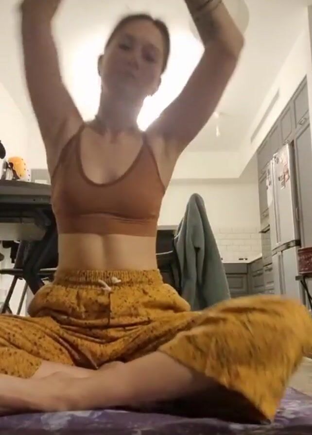 A woman is sitting cross-legged on a yoga mat in what appears to be an apartment. She is wearing a brown sports bra and yellow patterned pants. She has her arms raised above her head, her hands clasped, and she is bending to her right side. The apartment has a kitchen area with gray cabinets and stainless steel appliances in the background. A dining table is also visible. The lighting is soft and ambient.