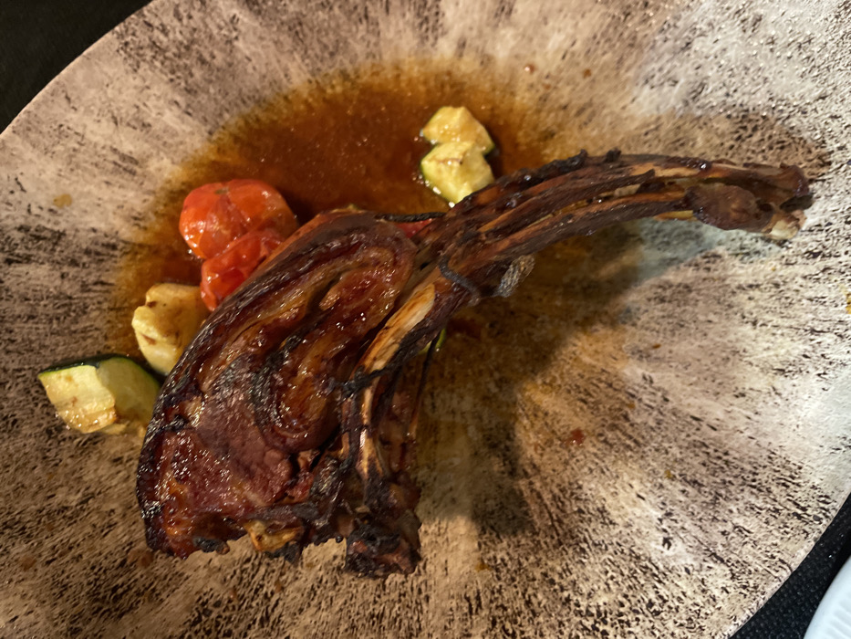 A close-up shot shows a rack of lamb on a textured plate. The lamb appears well-done, with a dark, almost charred exterior. Small roasted tomatoes and pieces of zucchini are scattered around it. A brown sauce or gravy pools on the plate. The plate itself has a marbled pattern with various shades of gray and brown.