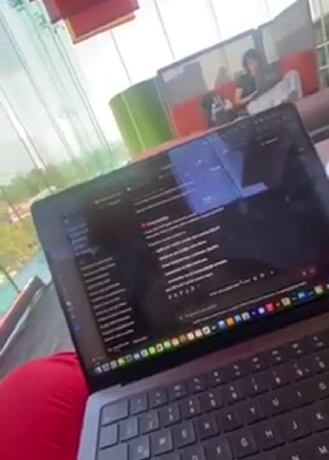 person sitting on a red surface while working on a MacBook laptop. The laptop screen displays lines of text, possibly code or notes, in a dark theme. Through the large glass windows behind the person, a view of a city with greenery is visible under a clear sky. The interior space includes modern furniture, such as colorful couches and chairs, and another person is seen sitting and using a laptop on a couch in the background. The building has a contemporary design with overhead panels in different colors, including red, contributing to a bright and airy atmosphere.