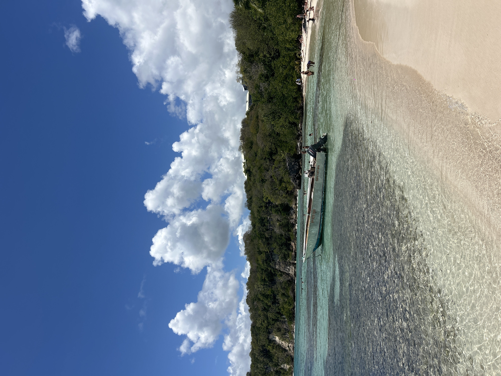 This image depicts a sunny tropical beach scene located in Le Gosier, France. The upper portion of the frame is dominated by a bright blue sky with numerous scattered white cumulus clouds. The background features a dense, verdant coastline composed of forested hills and visible rocky cliffs. On the crest of the hills towards the right, two light-colored buildings with red roofs are partially observable above the treeline. The midground is occupied by clear, turquoise-to-blue ocean water. Patches of dark marine vegetation are visible on the seabed beneath the transparent water, particularly in the left-center. A light-colored, single-hull boat with an outboard Yamaha motor is moored in the shallow water, positioned one-third from the left edge. The boat bears the registration "PP805558" on its side and the inscription "DIEU EST ROI" on its stern. Approximately 15-25 individuals are present in the scene. Several individuals are seen wading and swimming in the shallow water to the left and right of the boat. Others are visible along the curved, light-beige sandy beach that stretches from the lower right corner towards the center-right, either standing, bending over, or reclining on the sand. The waterline shows small waves gently breaking on the shore.