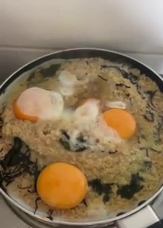 A close-up shot displays a frying pan on a gas stovetop, with four eggs cooking within it. The pan contains a beige, mushy substance alongside dark green seaweed strands, simmering in a clear liquid. The eggs exhibit varying levels of doneness, some more cooked than others. Steam rises from the pan, indicating the ongoing cooking process. The stovetop itself is white with a black burner visible beneath the pan. The backdrop is a plain white wall.