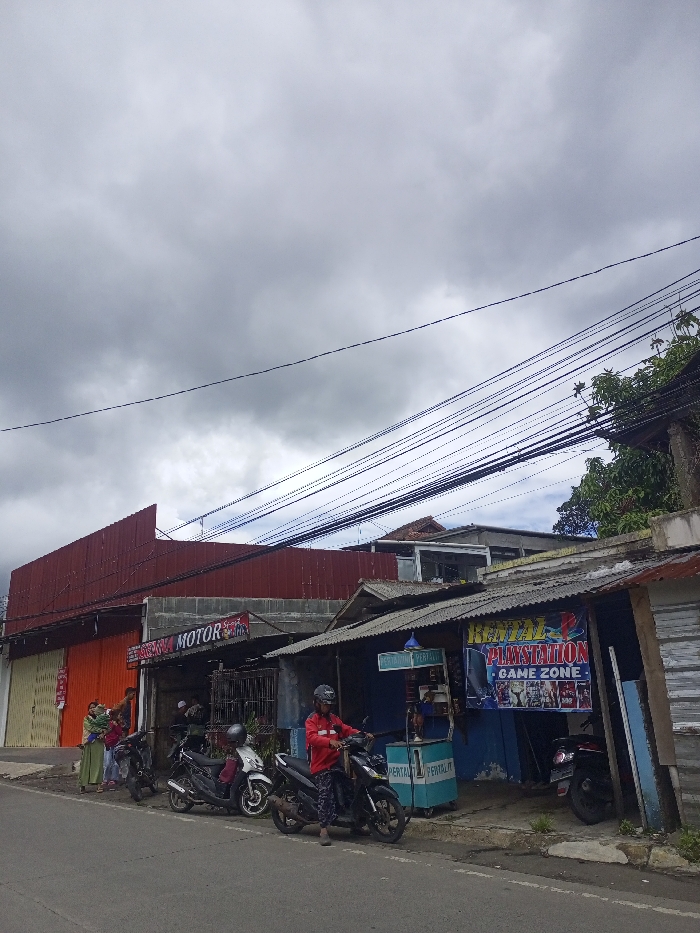 A street scene shows a row of small businesses under a cloudy sky. The shops have weathered façades, with signs for "MOTOR" and "RENTAL PLAYSTATION GAME ZONE." Several motorcycles are parked along the street. A person in a red shirt sits on one of the motorcycles. A group of people stands near a storefront with closed, orange roll-up doors. Above the buildings, power lines crisscross the sky.