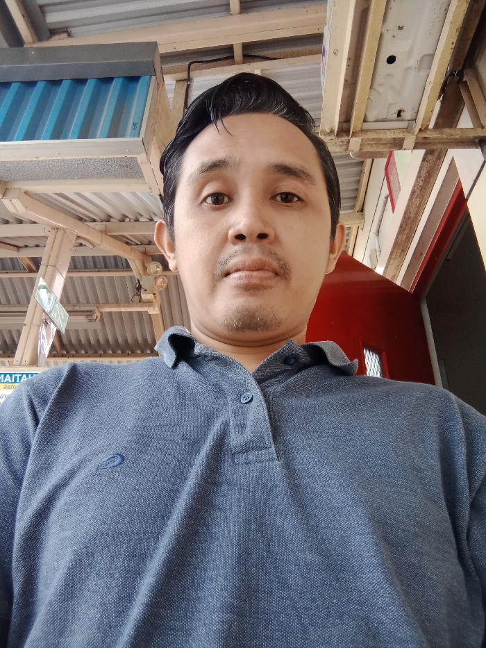 A person is shown from the chest up, wearing a blue-grey polo shirt. The person's hair is dark and slicked back. The background features a partially visible, unfinished ceiling structure with exposed wooden beams and metal corrugated sheeting. A red structure with a window is to the right. The lighting is diffused, and the focus is mainly on the person's face.