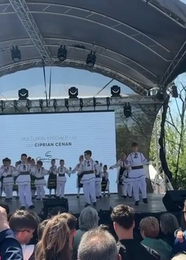 A group of children are performing a folk dance on an outdoor stage. The children are dressed in traditional Romanian white costumes with black vests. They are holding hands and moving in unison. Behind them is a large screen displaying text in Romanian. The stage is covered with a canopy and equipped with lighting and sound systems. A crowd of people is watching the performance, some holding up phones to record the event. The sky is blue and sunny. The event appears to be taking place in a park or open area.
