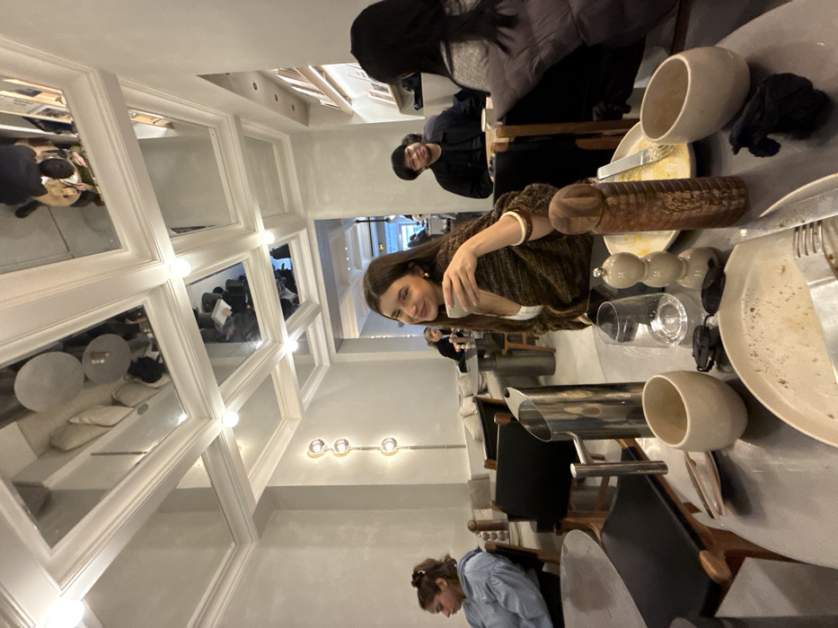 The image depicts an indoor scene within Marzocco Cafe, located at Rue du Pont Louis-Philippe, 75004 Paris, France. The environment is a contemporary cafe with light-colored walls and a distinctive coffered ceiling featuring mirrored panels. A vertical wall lamp with three concentric luminous rings is visible on the left wall. Four individuals are seated at tables. In the foreground, a young woman with long dark hair, wearing a striped brown cardigan over a white top and a white bangle, smiles towards the camera while holding a light-colored cup in her right hand. To her left, another young woman with dark hair tied back, wearing a light blue sweatshirt, looks away from the camera. Behind the focal woman, a man with dark hair and glasses, dressed in a dark jacket, looks towards the camera with a slight smile. A fourth woman, only partially visible on the far right, wears a dark puffer jacket. The metallic-topped table in the foreground contains a silver pitcher, a clear glass, two empty light-colored ceramic cups (one egg-shaped), a white plate with remnants of a meal (appears to be eggs), a fork, a knife, a pair of black sunglasses, a light-colored ceramic pepper grinder, and a dark wooden pepper grinder. Reflections of other patrons and the interior are visible in the mirrored ceiling.